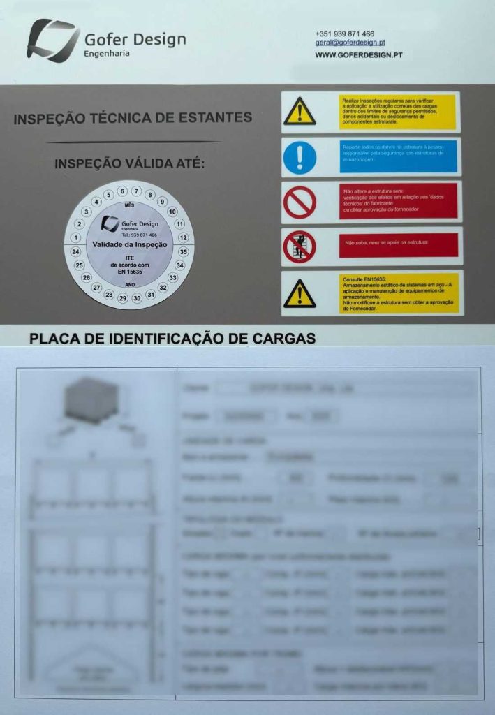 Placas de características – Deverão estar situadas em lugares claramente visíveis e ser inspecionadas para verificar se a informação contida corresponde à instalação real. Após a inspeção realizada pelo(s) técnico(s) especializado(s), será emitido um relatório detalhado com as medidas/recomendações de manutenção preventiva necessárias para garantir a segurança das estantes e um plano de ação para as melhorias necessárias.